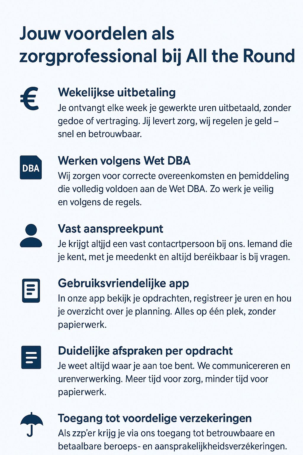 Je werkt in loondienst met stabiliteit en zekerheden zoals pensioen en loondoorbetaling bij ziekte. Wij regelen administratie en planning zodat jij kunt focussen op zorg.